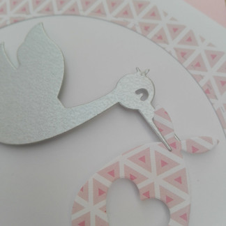 La cigogne est argentée. Elle tient dans son bec un petit sac rose reprenant les motifs de la carte, percé d'un coeur. La cigogne et le sac sont en reliefs (montés sur de la mousse adhésive).