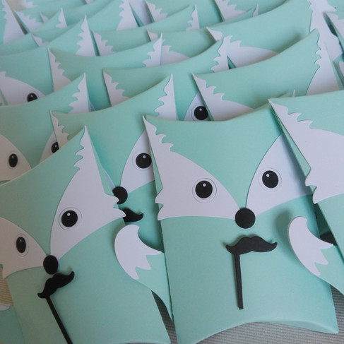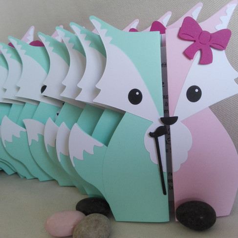 1ère partie d'une commande dont je suis déjà fan : 35 invitations au baptême d'un frère et une soeur, et le double de boîtes bébés renards coordonnées !
